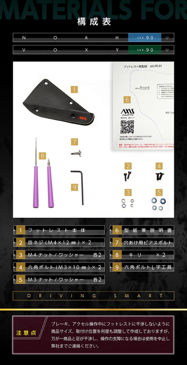 ・フットレスト本体 ・フットサイドキックガード ・フットサイドキックガード取付用付属品 ・皿ネジ M4×12㎜×2 ・M3ナット/ワッシャー 各2個 ・M4ナット/ワッシャー 各2個 ・六角ボルト M3×10㎜×2 ・型紙兼説明書 ・穴あけ用ピアスボルト ・キリ×2 ・六角ボルトL字工具 |