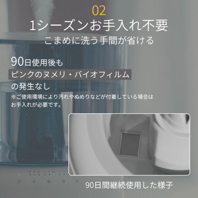 1. 12時間ごとに自動で99.9%除菌するハイブリッドテクノロジー 独自の「クリーンヒート」機能は、超音波式の省エネ性と加熱式の清潔性を融合。12時間ごとに水槽を自動で加熱除菌(約70℃)し、雑菌の繁殖を抑制します。リビングでは常に清潔なミストを届けます。 2. ぬめり知らずでワンシーズンお手入れ不要(※2) 水槽のぬめりやバイオフィルムの発生を90日間抑制(※2)。面倒な水回りの掃除から解放され、手間なく清潔を維持できます。お手入れが簡単だから、忙しい毎日でも安心です。 3. 家計に優しい電気代は約1/6の超省エネ設計(※3) 必要な部分だけを効率的に加熱するため、一般的な加熱式加湿器と比較して大幅なコストダウンを実現。静かな稼働音(最小35dBA)は寝室でも眠りを妨げません。 4. 床を濡らさないウルトラマイクロミスト パワフルな加湿力(最大500mL/h、プレハブ洋室14畳対応)を持ちながら、リフレクタ構造によりミストを微細化。超微細なミストが広がり、インテリアや床を濡らす心配がありません。 5. 給水・移動がストレスフリーな設計 大きな開口部で上から簡単に給水が可能。約3.1kgの軽量ボディと持ちやすい取っ手で、使用場所を変える際も楽に移動できます。 ※1 評価機関:一般財団法人 北里環境科学センター 報告書番号:北生発2025_0067 号/日本電機工業会自主基準HD-133「加湿器用水内のカビ・細菌に対する抑制性能評価試験」準拠/全ての菌を除菌できるわけではありません。 ※2 自社試験の結果であり、ご使用環境により汚れやぬめりなどが付着している場合はお手入れが必要です。 ※3 一般的な加熱式加湿器との比較。電力料金単価31円/kWhで算出。ご使用環境により異なります。 |