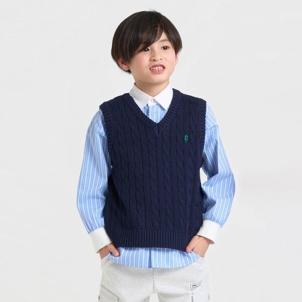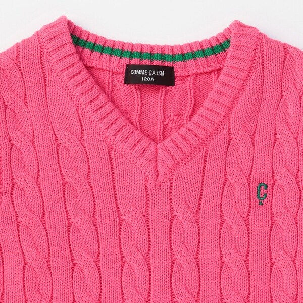 全体に編み込まれたケーブル柄が上品なVネックのニットベストです。