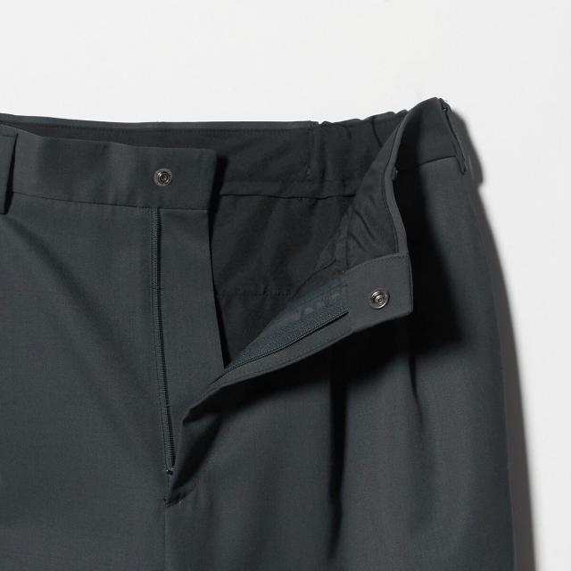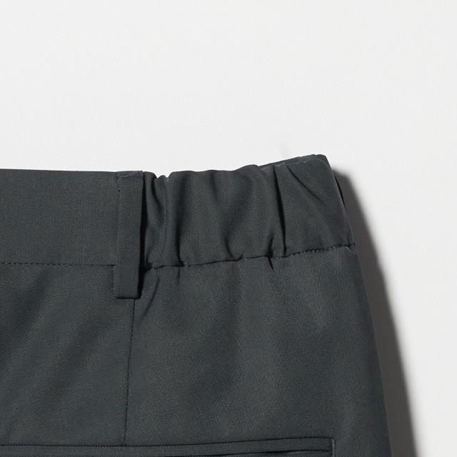 隠しドット釦でフロントをすっきり見せ、ウエストにはサイドゴムを仕込み、快適なフィット感を実現。