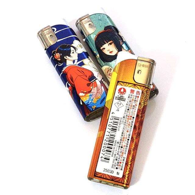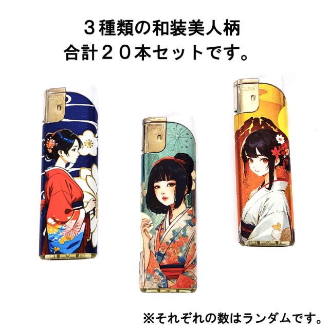 それぞれに和装の女性が描かれた使い切りガスライター20本セットです。