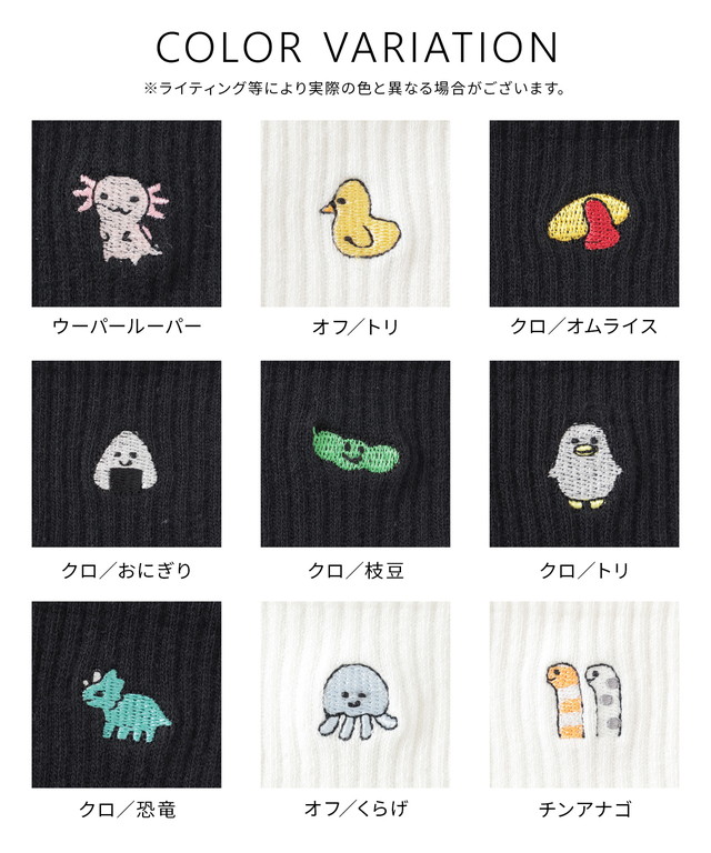 食べ物やアニマルなどのほっこりユニークなワンポイント刺繍。