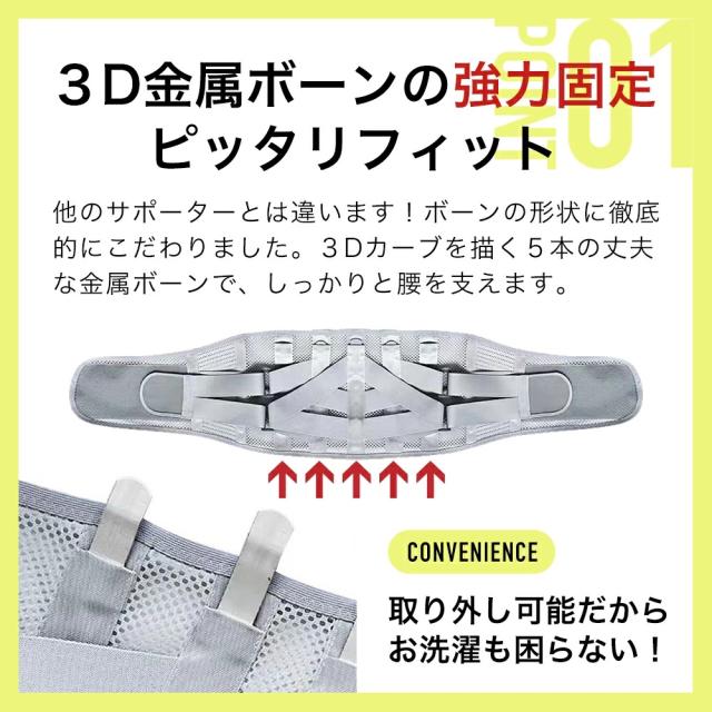 8本のベルトで負担を軽減・5本の金属3Dボーンで強力に固定します。
