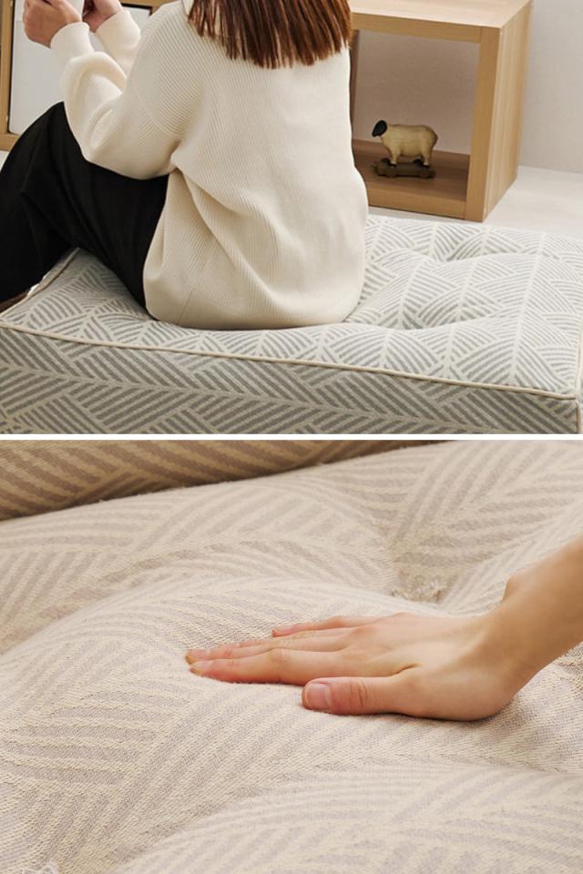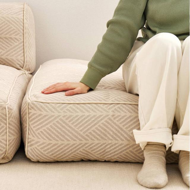 やさしい色合いのヘリンボーン調コットン素材と、思わずころんと寝転びたくなる包み込まれるようなフォルムが、空間にふんわりとした温もりと可愛らしさを演出します。北欧テイストやナチュラルインテリアとの相性もよく、置くだけでお部屋がやわらかな印象に。