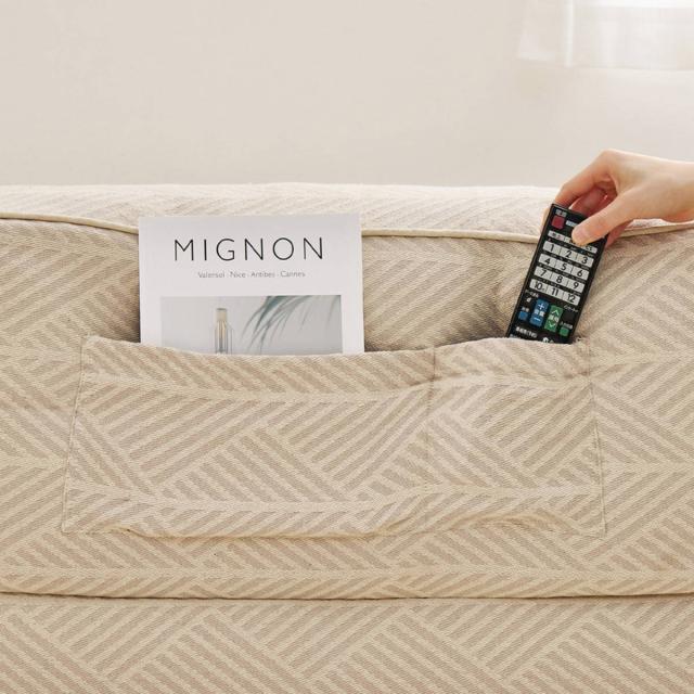ソファの背面には、リモコンやスマートフォンなどをさっとしまえる便利な収納ポケット付き。ソファまわりもすっきり整い、生活感を隠すことができます。くつろぎながらすぐに取りだせるのも嬉しいポイント。