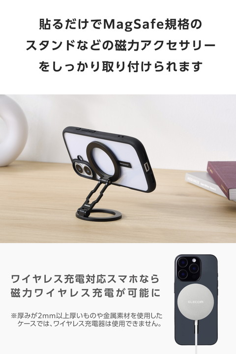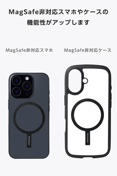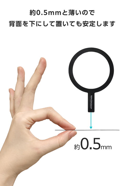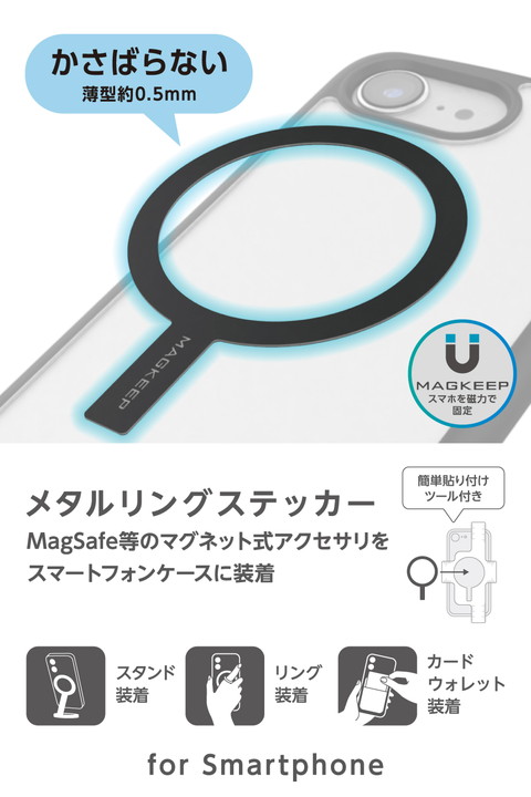 ケースに貼るだけで、さまざまなMagSafe対応アクセサリーが使えるようになるメタルリングステッカーです。MagSafe非対応のスマホケースでも、これを貼ればスマホリングやスタンド、カードケースなどの磁力アクセサリーをしっかり取り付け可能。薄型設計なので、ケースに貼ってもかさばらず、スマートに使えます。![]() ■ケースに貼るだけで、さまざまなMagSafe対応アクセサリーが使えるようになるメタルリングステッカーです。 ■MagSafe非対応のスマホケースに貼り付けることで、MagSafe規格のスマホリングやスタンド、カードケースなどの磁力アクセサリーをしっかり取り付けられます。 ■※スマホケースの素材や表面加工によっては、十分に貼り付かない場合があります。 ■厚さ約0.5mmと薄型設計なので、ケースに貼ってもかさばらず、スマートに使えます。 ■※一度取り外すと粘着力がなくなるため、貼り直しはできません。装着時はご注意ください。 ■簡単に正確な位置に貼り付けができる、貼り付けツールが付属しています。 ■※厚みが2mm以上厚いものや金属素材を使用したケースでは、ワイヤレス充電器は使用できません。 ■シンプルなカラーリングで、ケースのデザインやカラーに自然に馴染みます。 ■自社環境認定基準を1つ以上満たし、『THINK ECOLOGY』マークを表示した製品です。 ■環境保全に取り組み、製品の包装容器が紙・ダンボール・ポリ袋のみで構成されている製品です。 ![]() ■セット内容:リング×1、貼り付けツール×1、固定用シール×4 ■材質:本体:鉄、貼り付け面:アクリル系粘着材 ■外形寸法:幅約55mm×厚み約0.5mm×高さ約79mm ■カラー:ブラック |