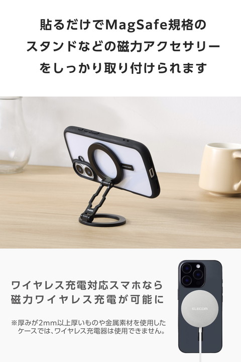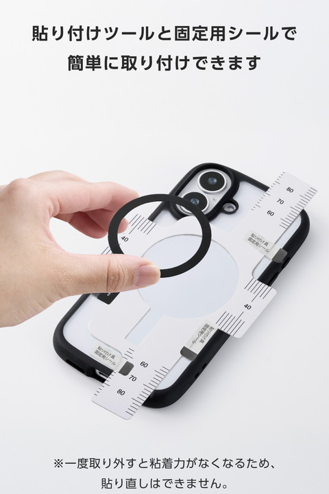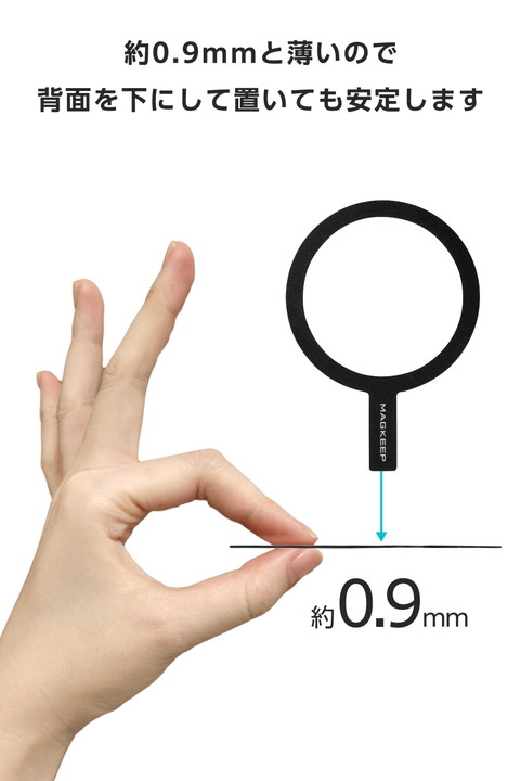 ケースに貼るだけで、さまざまなMagSafe対応アクセサリーが使えるようになるマグネットリングステッカーです。MagSafe非対応のスマホケースでも、これを貼ればスマホリングやスタンド、カードケースなどの磁力アクセサリーをしっかり取り付け可能。内蔵マグネットにより、アクセサリーを固定する強力な吸着力が特長です。![]() ■ケースに貼るだけで、さまざまなMagSafe対応アクセサリーが使えるようになるマグネットリングステッカーです。 ■MagSafe非対応のスマホケースに貼り付けることで、MagSafe規格のスマホリングやスタンド、カードケースなどの磁力アクセサリーをしっかり取り付けられます。 ■※スマホケースの素材や表面加工によっては、十分に貼り付かない場合があります。 ■内蔵マグネットにより、アクセサリーをしっかりと固定できる強力な吸着力が特長です。 ■※一度取り外すと粘着力がなくなるため、貼り直しはできません。装着時はご注意ください。 ■簡単に正確な位置に貼り付けができる、貼り付けツールが付属しています。 ■※厚みが2mm以上厚いものや金属素材を使用したケースでは、ワイヤレス充電器は使用できません。 ■シンプルなカラーリングで、ケースのデザインやカラーに自然に馴染みます。 ■自社環境認定基準を1つ以上満たし、『THINK ECOLOGY』マークを表示した製品です。 ■環境保全に取り組み、製品の包装容器が紙・ダンボール・ポリ袋のみで構成されている製品です。 ![]() ■セット内容:リング×1、貼り付けツール×1、固定用シール×4 ■材質:本体:マグネット・PET、貼り付け面:アクリル系粘着材 ■外形寸法:幅約55mm×厚み約0.9mm×高さ約77mm ■カラー:ブラック |