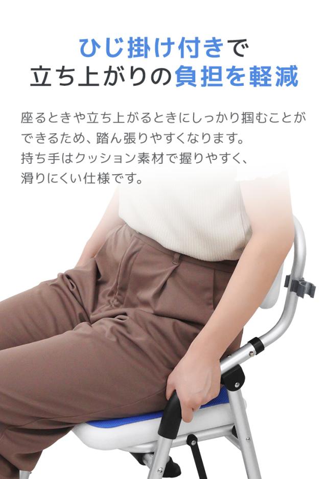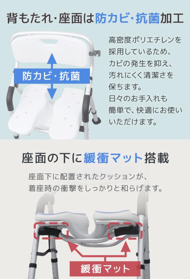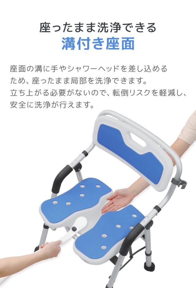 両側に肘掛けがあり、立ち座りをしっかり支えて転倒リスクを軽減。背もたれ付きで長時間座っても姿勢が安定し、介助者も安心して入浴補助ができます。