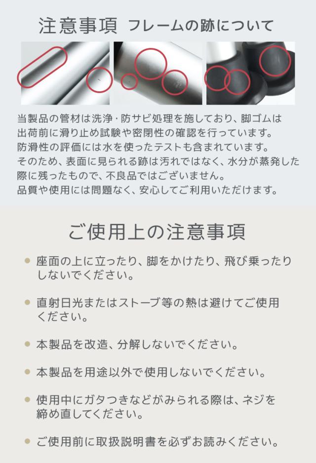 ・座面の上に立ったり、脚をかけたり、飛び乗ったりしないでください。 ・直射日光またはストーブ等の熱は避けてご使用ください。 ・本製品を改造、分解しないでください。 ・本製品を用途以外で使用しないでください。 ・使用中にガタつきなどがみられる際は、ネジを締め直してください。 ・商品は、モニターによって色合いが異なって見える場合があります。 ・仕様・デザインは改良のため予告なく変更することがあります。 |
