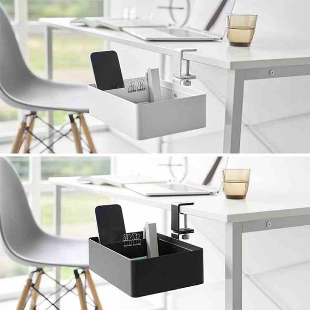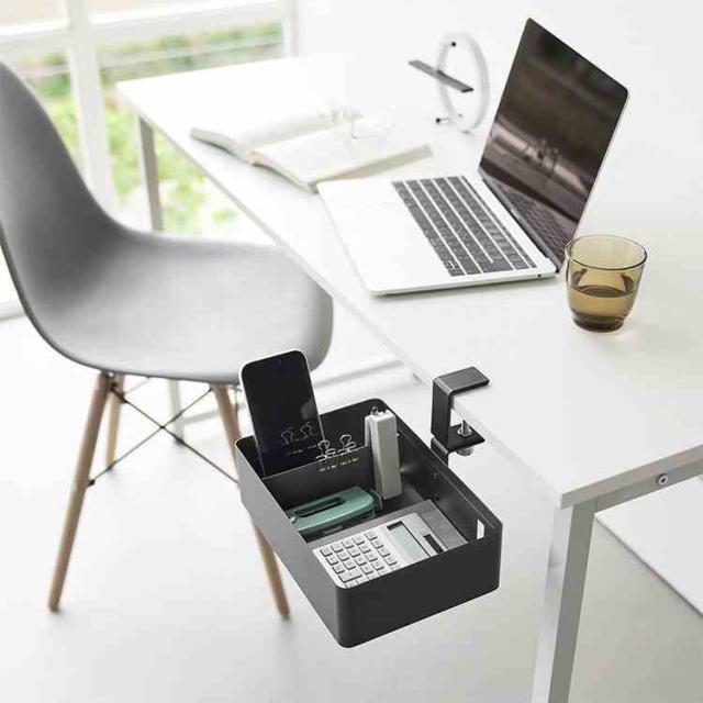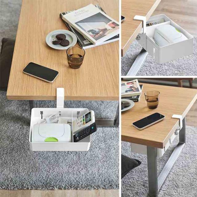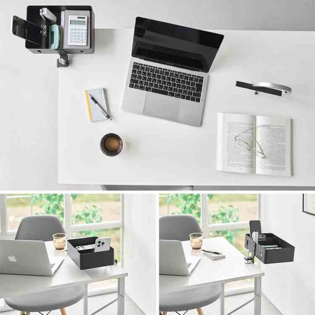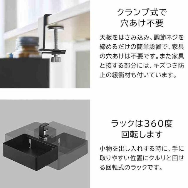 手に取りやすいテーブル横に取り付けできる、360度回転式の収納ラックです。設置場所や用途に合わせて、デスク下側・上側の2通りの取り付けが可能。クランプ式の固定構造でしっかりと設置できます。