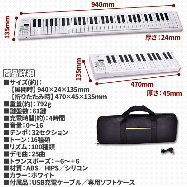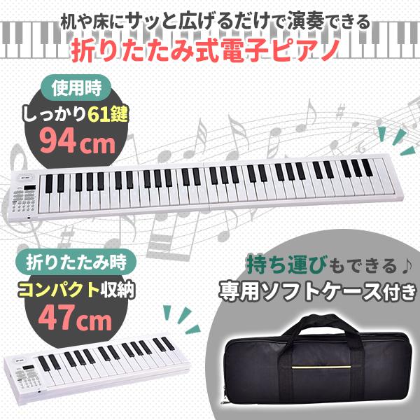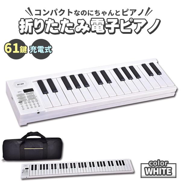 電子ピアノ 61鍵盤 電子キーボード 折りたたみ 61キー 充電式 ピアノ ホワイト 白 キーボード デジタルピアノ 収納ケース 折り畳み式 収納バッグ 楽器 演奏 軽量