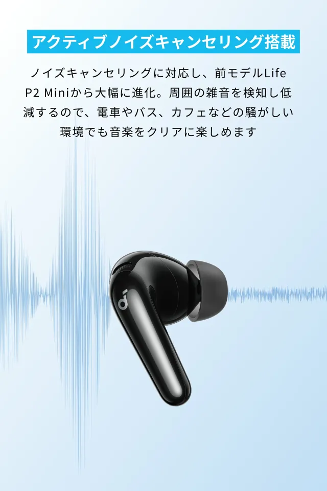 ノイズキャンセリングに対応し、前モデルLife Miniから大幅に進化。周囲の雑音を検知し低減するので、電車やバス、カフェなどの騒がしい環境でも音楽をクリアに楽しめます