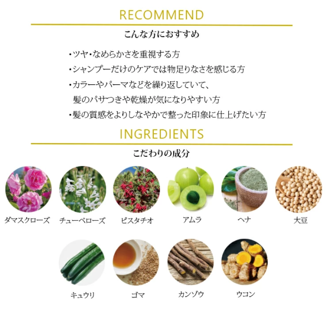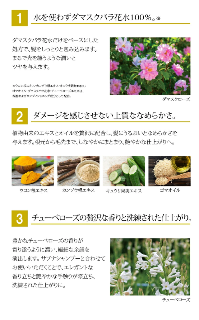 | 【水を使わず、ダマスクバラ花水のみで仕立てたヘアトリートメント】 髪のパサつきやダメージが気になったら、植物由来成分でうるおいとツヤをプラス。 指通りなめらかな髪へ導きます。 チューベローズの贅沢な香りに包まれながら、上質なケアタイムを。 ○水を使わずダマスクバラ花水100%※。 ダマスクバラ花水だけをベースにした処方で、髪をしっとりと包み込みます。まるで光を纏うような潤いとツヤを与えます。 ※ウコン根エキス・カンゾウ根エキス・キュウリ果実エキス・ゴマオイル・ダマスクバラ花水・チューべローズエキスは、保湿およびコンディショニング成分として配合。 ○ダメージを感じさせない上質ななめらかさ。 植物由来のエキスとオイルを贅沢に配合し、髪にうるおいとなめらかさを与えます。根元から毛先まで、しなやかにまとまり、艶やかな仕上がりへ。 ○チューベローズの贅沢な香りと洗練された仕上がり。 豊かなチューベローズの香りが寄り添うように漂い、繊細な余韻を演出します。 サブナシャンプーと合わせてお使いいただくことで、エレガントな香り立ちと艶やかな手触りが際立ち、洗練された仕上がりに。 <使用期限について> 未開封の状態で製造から3年です。直射日光、高温多湿を避けて常温保存し、開封後はなるべく早くご使用ください。 |