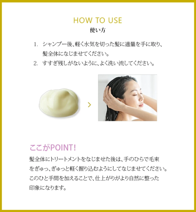 1.シャンプー後、軽く水気を切った髪に適量を手に取り、髪全体になじませてください。 2.すすぎ残しがないように、よく洗い流してください。 【ここがPOINT!】 髪全体にトリートメントをなじませた後は、手のひらで毛束をぎゅっ、ぎゅっと軽く握り込むようにしてなじませてください。 このひと手間を加えることで、仕上がりがより自然に整った印象になります。 |