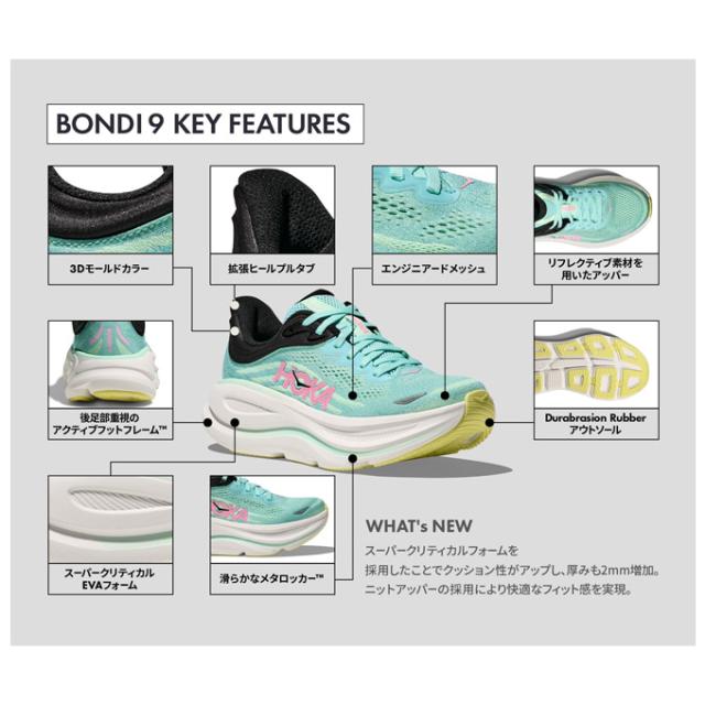 HOKAラインナップの中で人気の高いボンダイシリーズから、隅々まで一新されたボンダイ9(BONDI 9)が登場。
