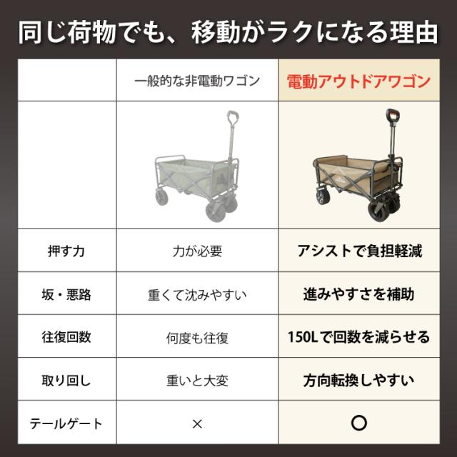 電動 アウトドアワゴン 150L大容量 最大6km以上走行 充電式 キャリーワゴン ストッパー付き 折りたたみ キャンプ BBQ 運動会 荷物運搬