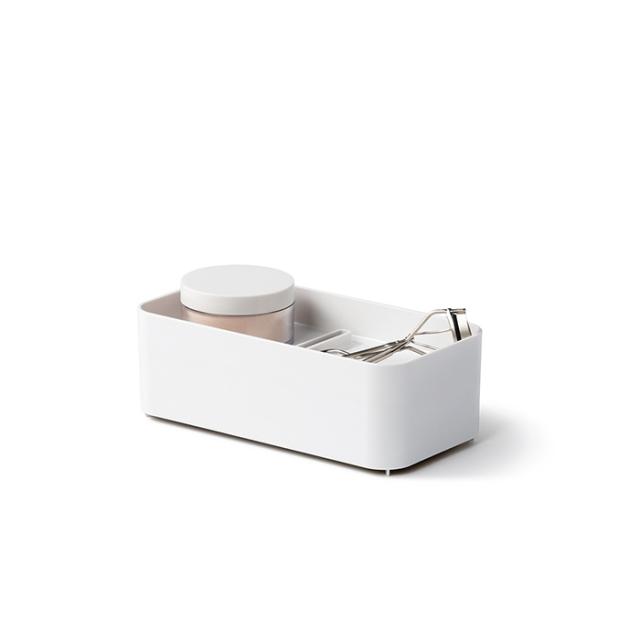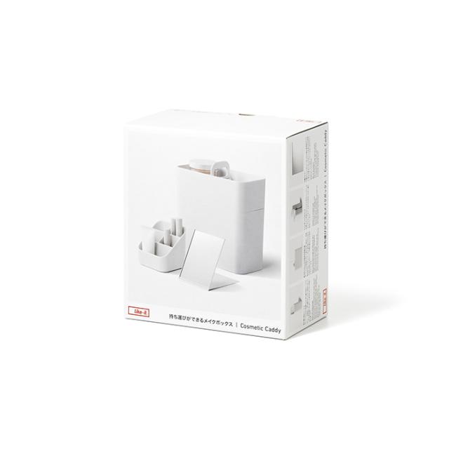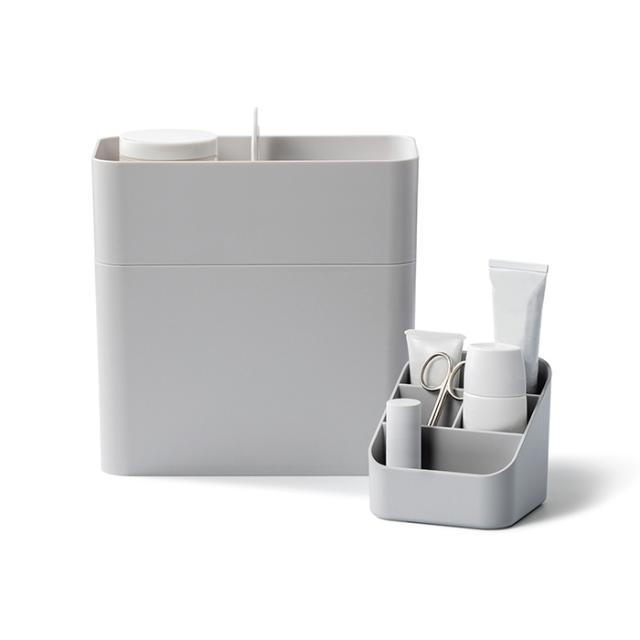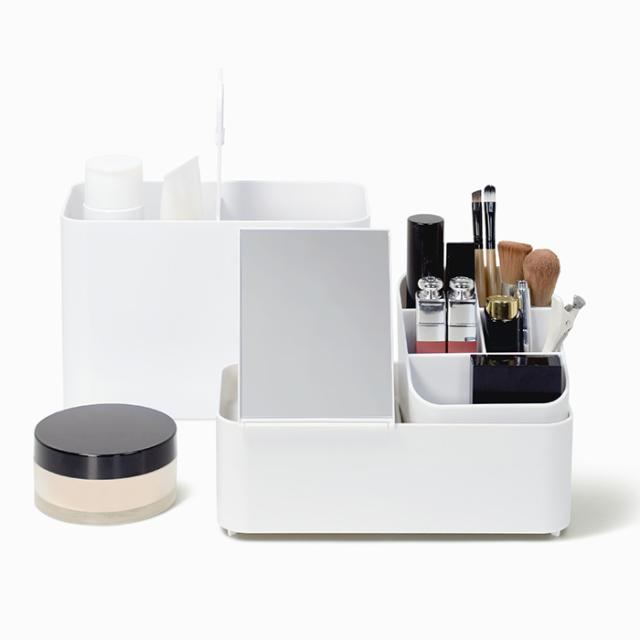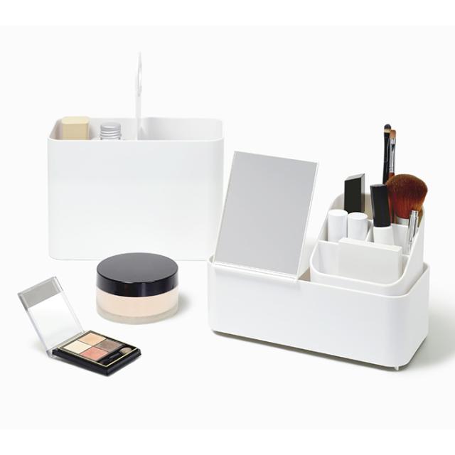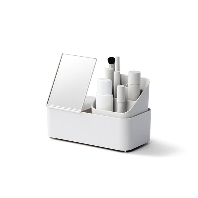 背の高いボトルが入れられる深さがあり、ミラーや仕分け用のボックスもセットになった機能的なアイテムです。