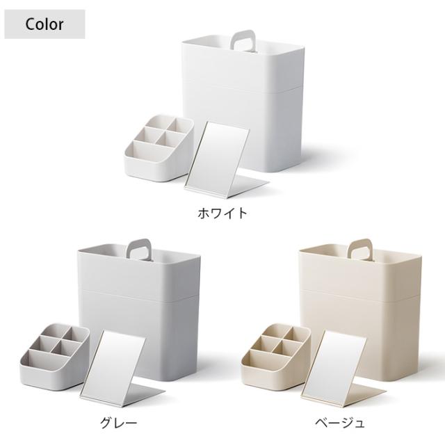 ミラーと仕分け収納付き 持ち手付きのスリムなメイクボックス