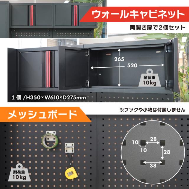 ローラーキャビネット付きで使い勝手抜群! レッドのアクセントが映えるガレージキャビネット ●キャビネット、ロッカー、メッシュボードなどの大容量壁面収納セット ●コンビの一部がキャスター付きで自由に移動することができ、単体での使用や、空いた場所へスツールを置いて作業台にするなど、幅広く活躍できます ●ローラーキャビネットは全段に傷を防ぐウレタンマットを敷いており、ベアリングレールで開閉もスムーズ ●両開きキャビネットは可動式の棚板(1枚)があり3段階でスペース区切り調整ができます ●ロッカーやキャビネットの両開き扉はマグネットキャッチ付きで、約100度開きます ●全4ヵ所(両開きロッカー(上下)・両開きキャビネット・ローラーキャビネット)に鍵が付いており、引出しは全段ロックが可能 鍵は4本で、全て共通です ●使い勝手のいいメッシュボードは、マグネット等で工具や文具を収納することができます ●両開き上下ロッカーと両開きキャビネットの配置は変更可能 ※商品は組立前の状態でお届けいたします ※組立、連結はお客様ご自身で、2〜3人で行ってください ※水平で安定した場所に設置してご使用ください 【関連商品】 ★L字フック 3個セット 品番:CMB-R |