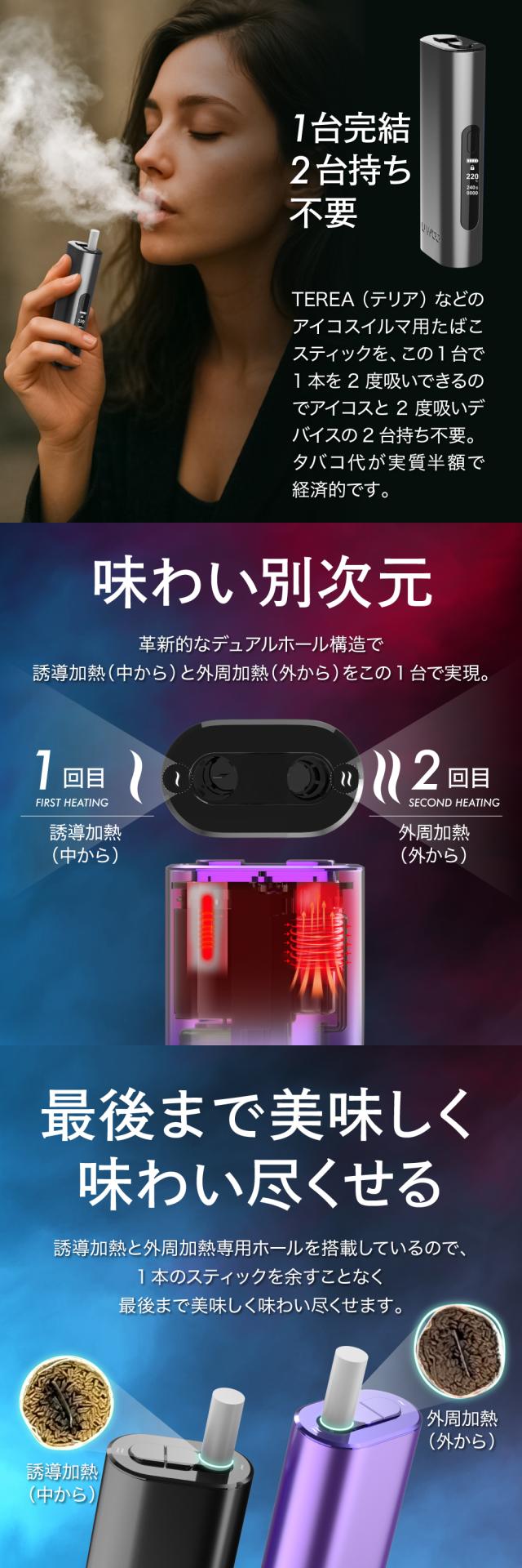 TEREA(テリア)などのアイコスイルマ用たばこスティックを、この1台で1本を2度吸いできるのでアイコスと2度吸いデバイスの2台持ち不要。