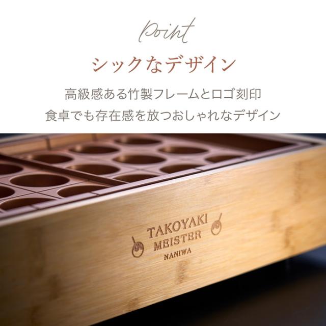 Takoyaki Meister [感動!たこ焼きマイスター] (ATM-818-BB) たこ焼きマイスター 家庭用たこ焼き器の不満をゼロへ。 これまでの家庭用たこ焼き器の不満点を解消すべく 本場・大阪の家電メーカーが、本気でこだわり抜いて開発した「たこ焼き器」。 焼きムラを抑え、革新的な焼き方技法で返し技いらず。 誰でも簡単に職人級の美味しいたこ焼きが焼けることに感動!します。 ■サイズ:約W425×D225×H106(mm) ■質量:約3.1kg ■電源:AC100V 50/60Hz ■消費電力:1,200W ■電源コード長さ:約1.4m ■穴直径:46mm ■材質: 本体:竹 プレート:アルミダイカスト (フッ素加工 チタン入り) ■付属品: たこ焼きの作り方 竹串(10本) ※記載は商品仕様の一部です。仕様説明不足等の理由での返品はできません。特に適合等は必ずご確認ください。