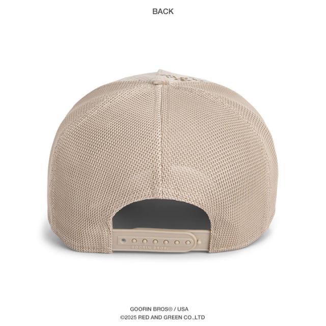 型番は、上部でつままれた1枚のフロントパネルに縮み・型崩れ防止の芯があり、メッシュ仕様のリアパネルが特徴的な「メッシュキャップ」。「メッシュ帽」や「トラッカーキャップ」、「スナップバックキャップ」、などとも呼ばれる高めのクラウンと四角型カーブバイザーによる、カジュアルな定番シルエット。