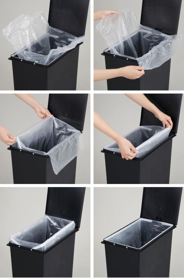 UNEEDのゴミ箱、ペダルペールにちょうどよいサイズのゴミ袋45Lです。袋止めにきれいにセットでき、前後がもたつかずスッキリ設置できます。