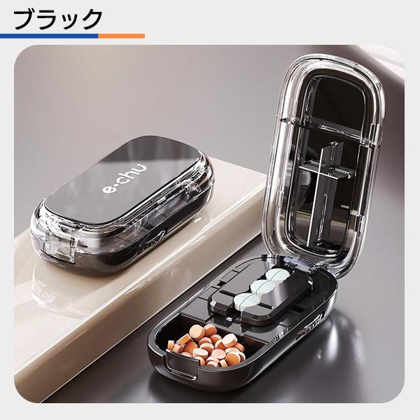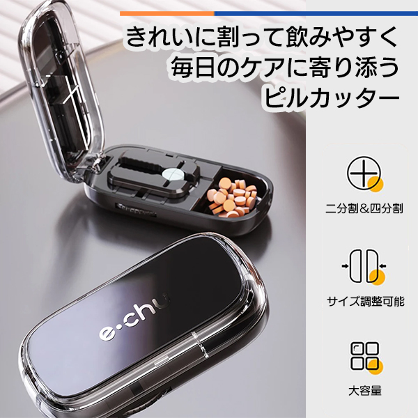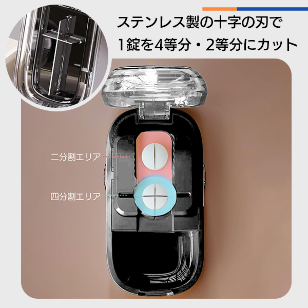 ピルカッター 錠剤カッター 4分割ピルカッター 薬カッター 薬切り器 錠剤分割器 クロスブレード コンパクトピルカッター 薬ケース付き 薬収納 洗えるピルカッター 調整機能付き 多機能ピルカッター 携帯用薬カッター お薬管理 介護用品 服薬補助 ブラックピルカッター 高齢者向け 薬の服用補助