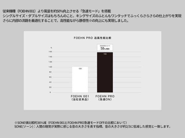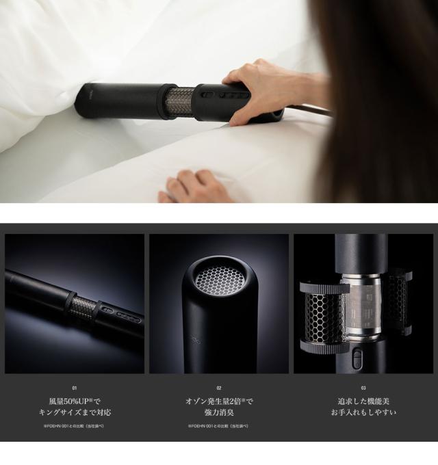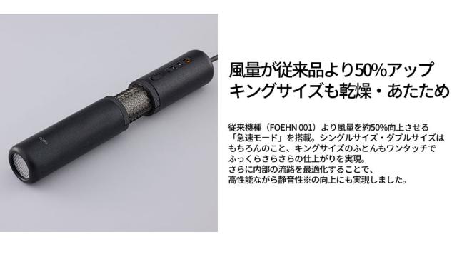 従来機種(FOEHN 001)より風量を約50%向上させる「急速モード」を搭載。シングルサイズ・ダブルサイズはもちろんのこと、キングサイズのふとんもワンタッチでふっくらさらさらの仕上がりを実現。