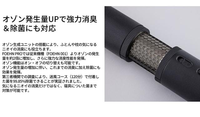 オゾン生成ユニットの搭載によりふとんや枕の気になるニオイの消臭にも役立ちます。FOEHN PROでは従来機種(FOEHN 001)よりオゾンの発生量を約2倍に増加しさらに強力な消臭性能を発揮。オゾン機能はオン・オフの切り替えも可能です。