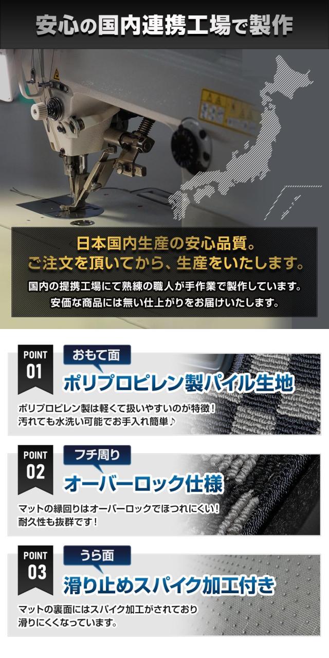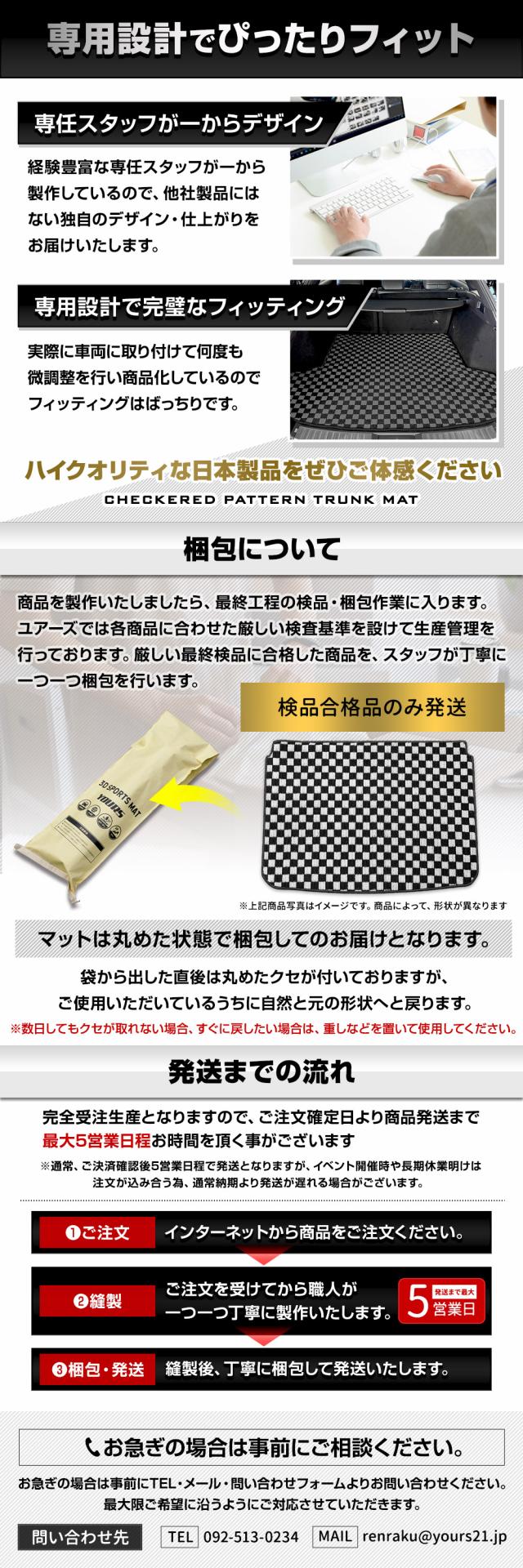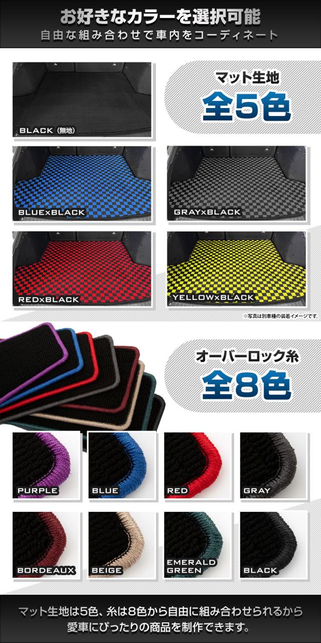 オシャレなチェック柄のマットで車内の雰囲気がガラリと変わってイメージチェンジにも♪ インテリアとしても優秀なのはもちろんですが、機能性もばっちり! 縁部分オーバーロックの糸のカラーも、全8色から選べるようになりました。 マット×糸の色の組み合わせは自由自在!愛車に合わせたカラーリングをお楽しみいただけます♪ 車種専用だから車の形状にぴったりフィットして、トランク側面への汚れや傷をしっかりカバーします。 裏面には滑り止めのスパイク加工済みです。 ■安心の国内提携工場にて製造 国内の提携工場にて熟練の職人が手作業で製作しています。 安価な商品には無い仕上がりをお届けいたします。 |