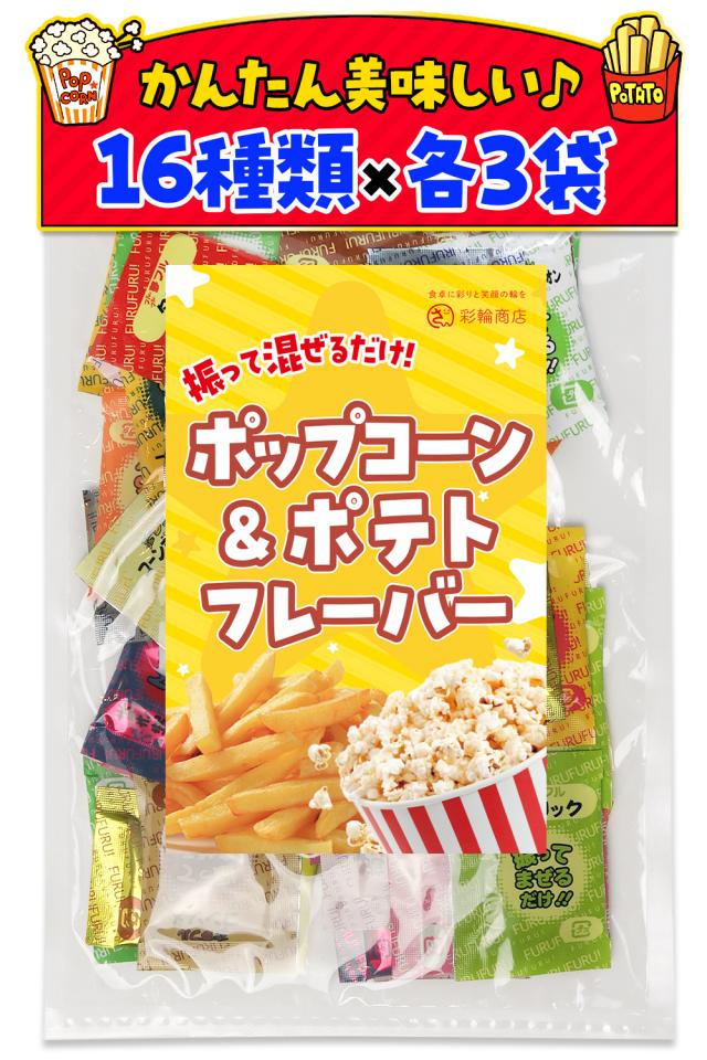 【ポップコーン&ポテトフレーバー16種類×各3袋】シャカシャカ振って、粉を混ぜるだけ!パウダーで簡単に味変可能で、アレンジ無限大!