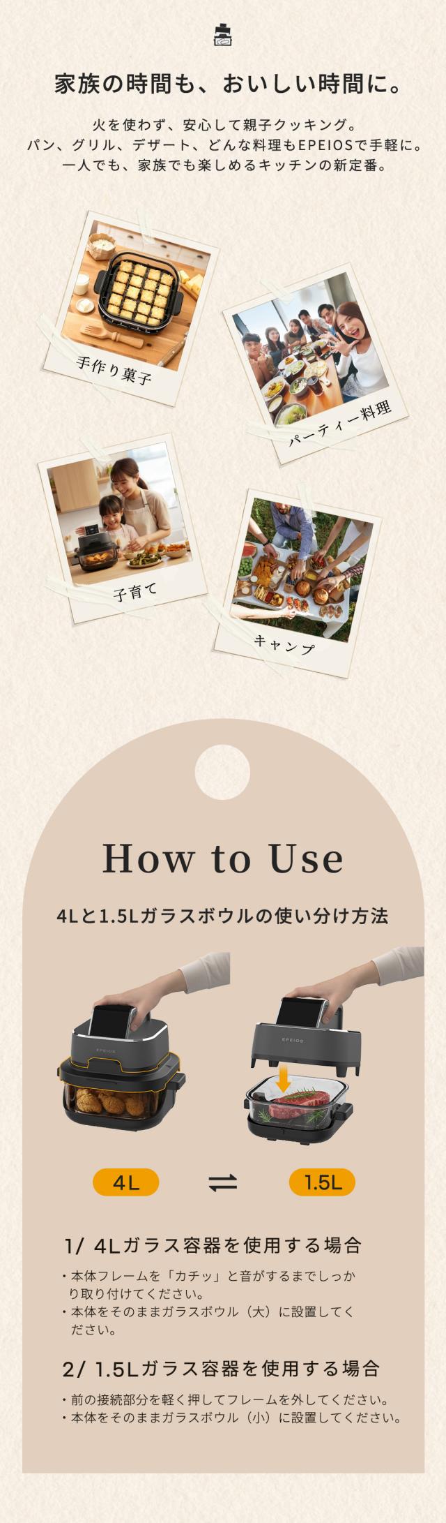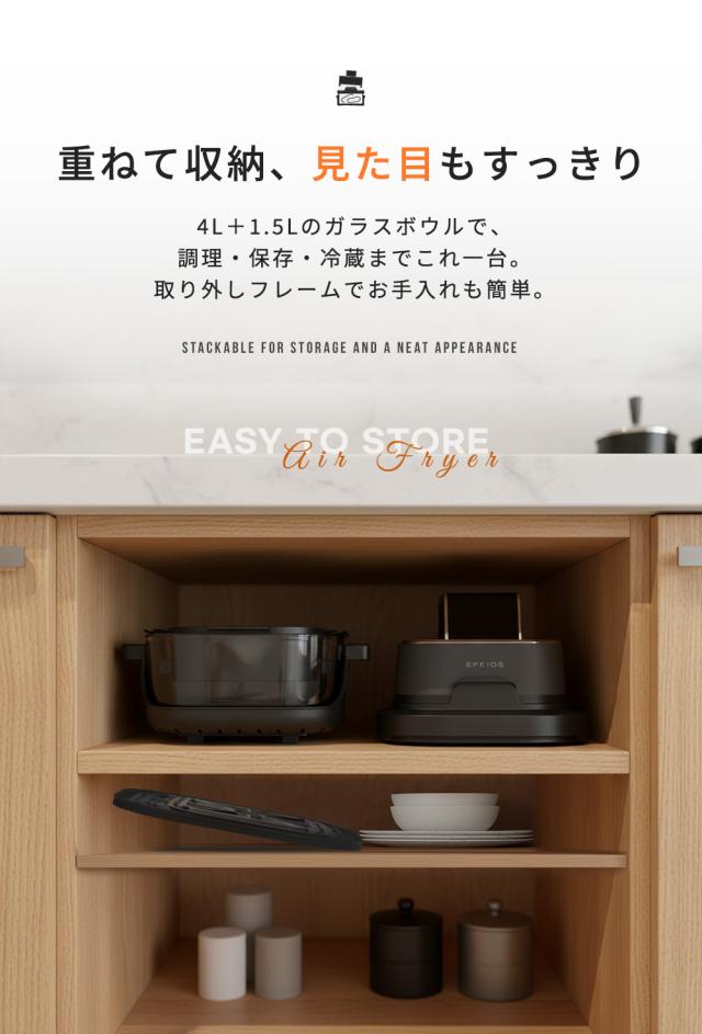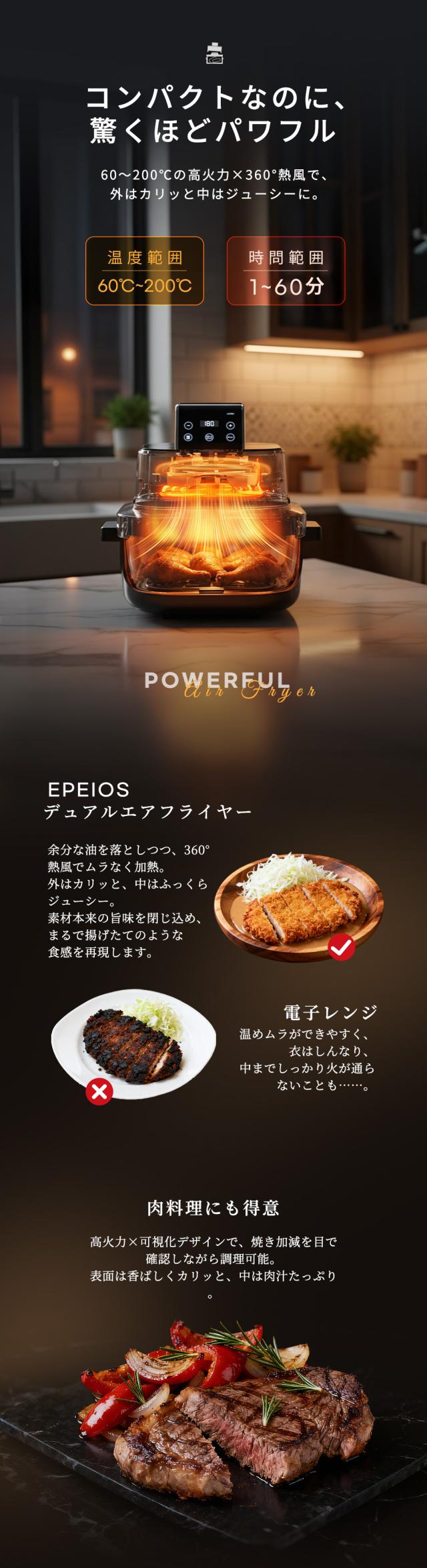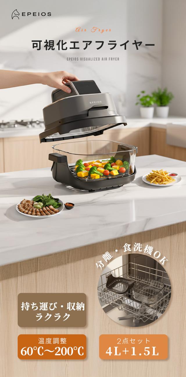 エペイオス(Epeios) ノンフライヤー 4L+1.5L 2点セット 大容量 エアフライヤー 2段同時調理 ガラス窓付き 360度熱風循環 食洗機対応 トレーニング 体重管理 家庭用 ノンオイル フライヤー 卓上 ヘルシー調理 大人数向け パーティー