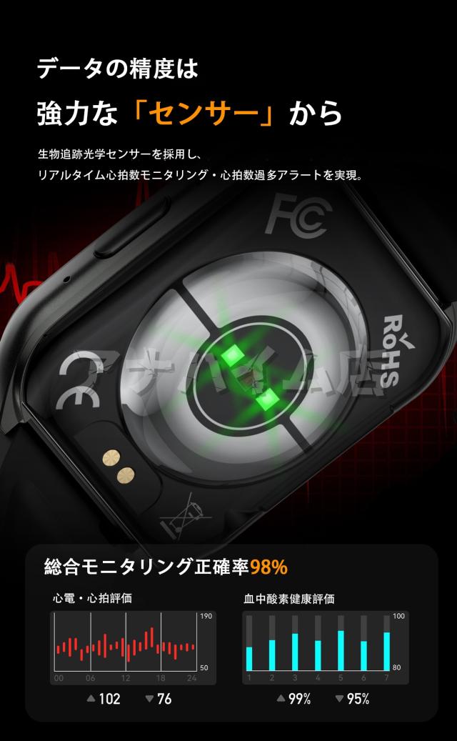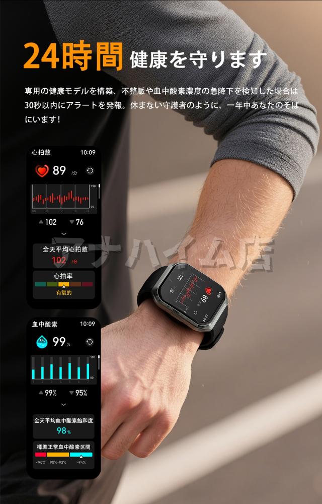 ●24H健康管理:24時間自動/手動心拍数、血中酸素、睡眠監視やアラートなどの測定機能付き