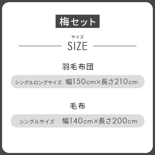 羽毛布団 (約)幅150cm×長さ210cm(シングルサイズ) 2枚合わせ毛布 (約)幅140cm×長さ200cm(シングルサイズ) |