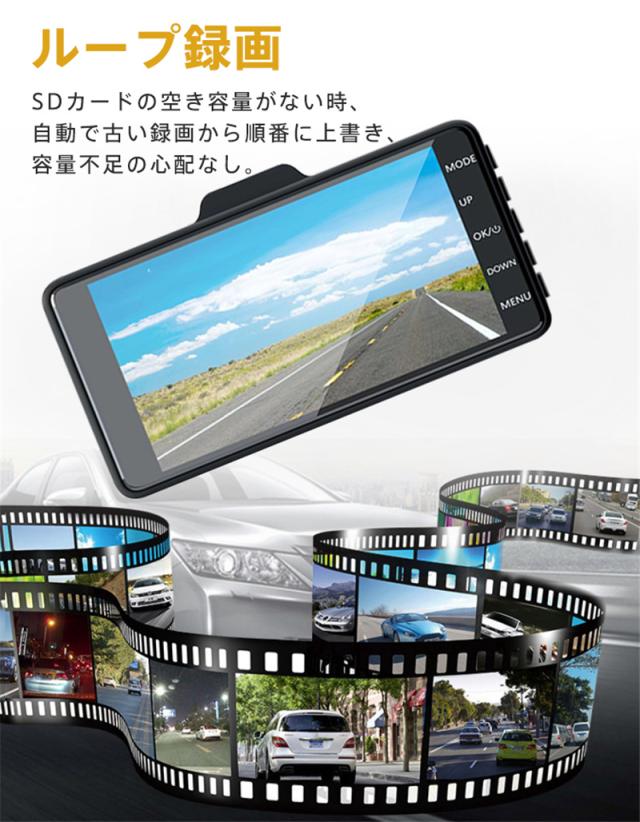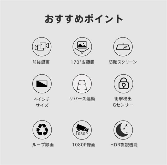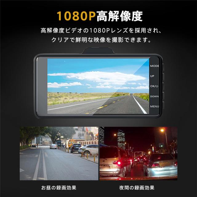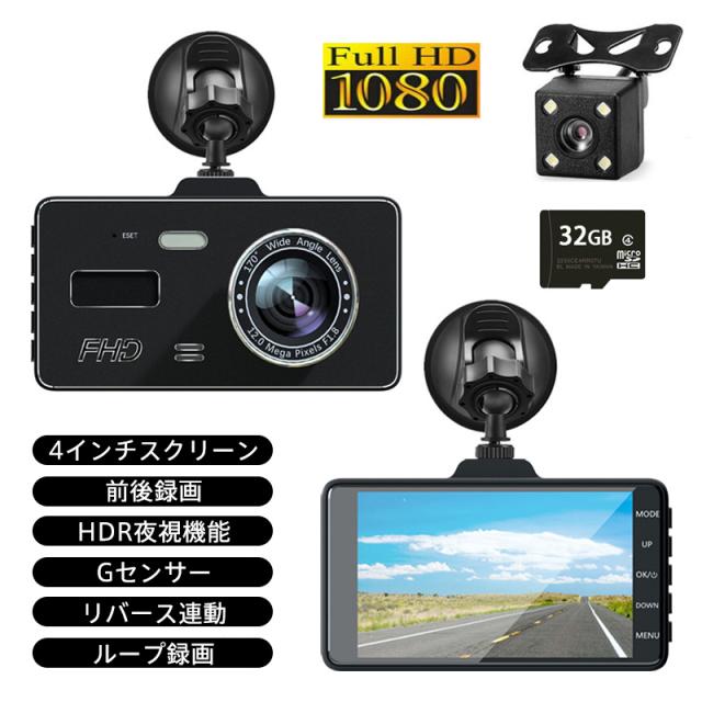 ドライブレコーダー 前後録画 1080P 4インチ 170°超広角 Gセンサー HDR夜視 ループ録画 リバース連動 交通事故 取り付け簡単 2カメラ