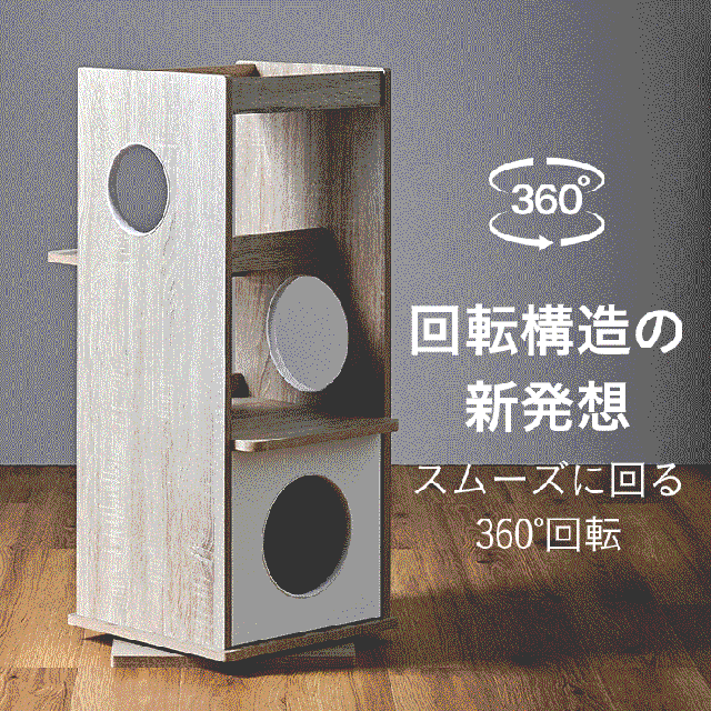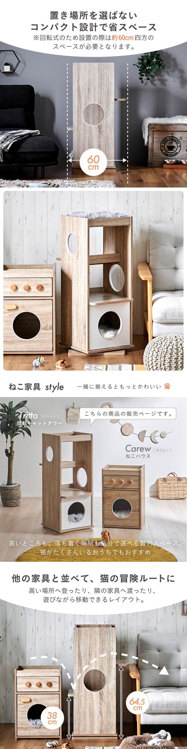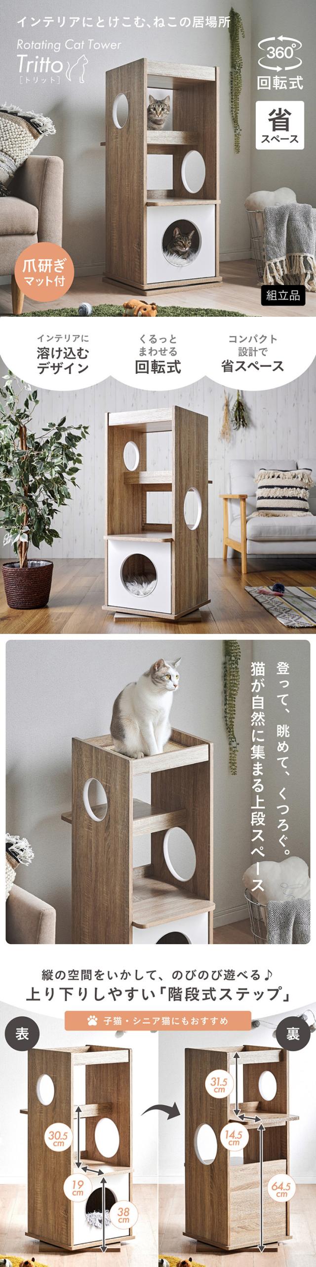 キャットタワー スリム 木製 おしゃれ 猫タワー 猫用 回転式 爪研ぎマット付き Tritto(トリット) ねこタワー 大型猫 据え置き 多頭飼い シニア 猫ハウス キャットハウス 爪とぎ 省スペース 階段式