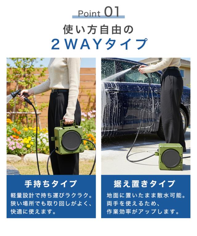 手持ちと据え置きの2WAYで使える万能ホースリール