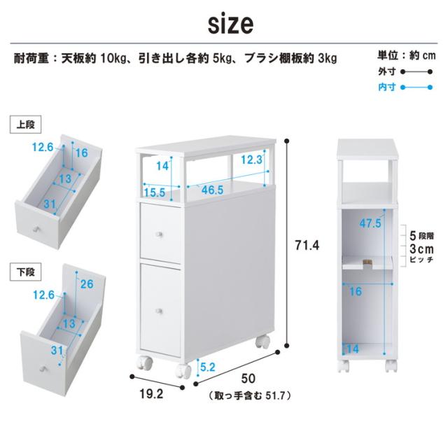 スペースを取らずスマートに置ける省スペース設計の多機能トイレラック(オープンタイプ)です。引き出しの反対側にはトイレブラシが収納でき、棚板は高さを3cmピッチで5段階に調整可能。キャスター付きで移動もラクラク。収納力と使い勝手に優れたトイレ周りの必需品です。