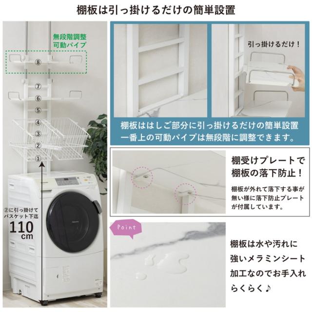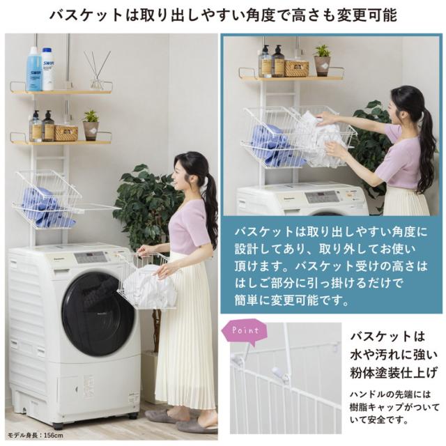 バスケット付き突っ張り洗濯機ラック 高さ200~255cm調整 突っ張り式棚板8段階調節 省スペース設置 スチールフレーム メラミン棚板 洗濯収納 バスケット2個付き【送料無料】