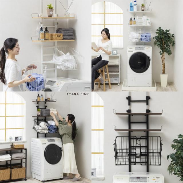 突っ張り洗濯機ラック | バスケット付き突っ張り洗濯機ラック |