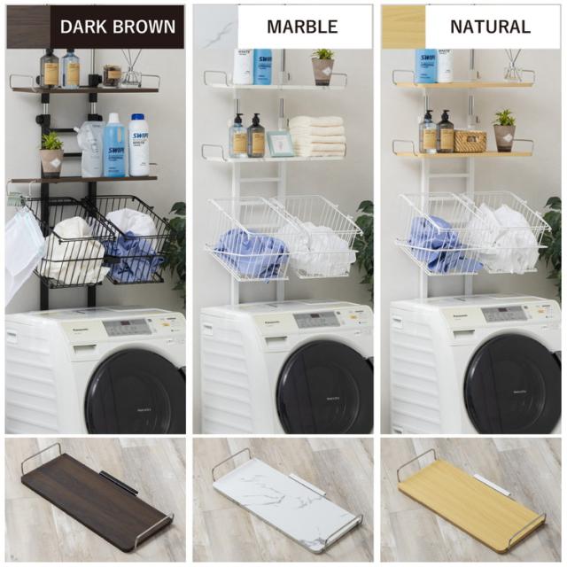 3cm以上の隙間があれば設置可能なバスケット付き突っ張り洗濯機ラック。壁を傷つけずにしっかり固定できる突っ張り式。棚板はハシゴに引っ掛けるだけで8段階の高さ調節が簡単にできます。持ち運び可能なバスケット2杯付きで、洗濯用品の整理に便利。清潔感あるホワイトフレームにナチュラルや石目柄の棚、シックなブラックフレームにはダークブラウンの棚を組み合わせています。