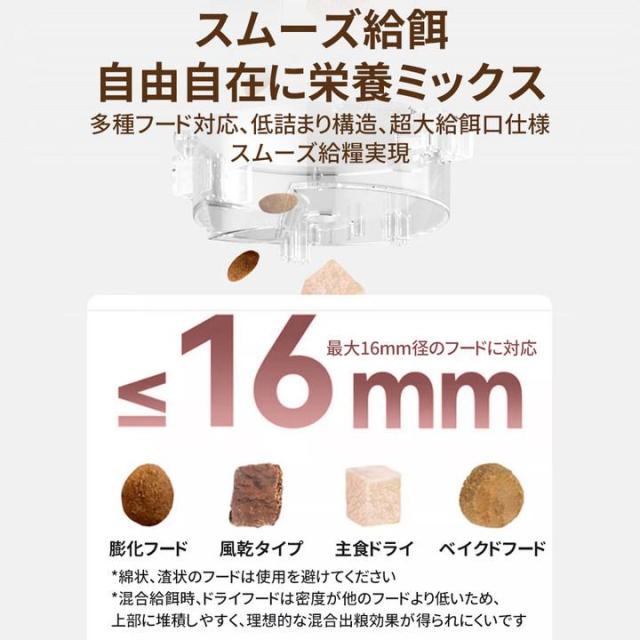 最大16mm径のフードに対応し、各種フードをスムーズに給餌いたします。低詰まり構造により、栄養バランスの自由度をアップいただけます。