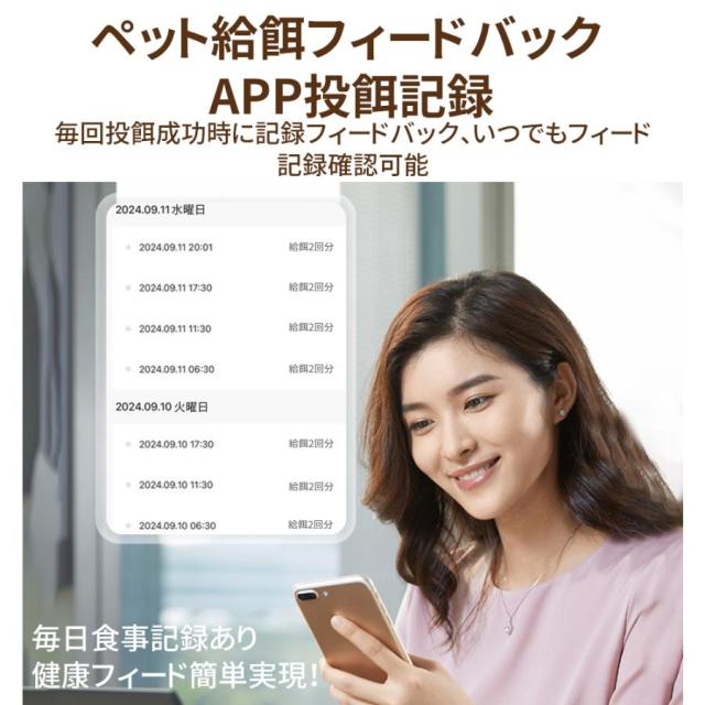 専用 APP で投餌記録を確認いただけます。給餌履歴を詳細管理し、外出先からもタッチ給餌・定時設定が可能で、食事を完全コントロールいただけます。