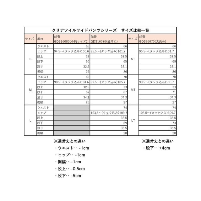 L:ウエスト74−79 ヒップ103.5−(タック込み)109.7 股下69 股上33.5 渡り幅35.5 裾幅28