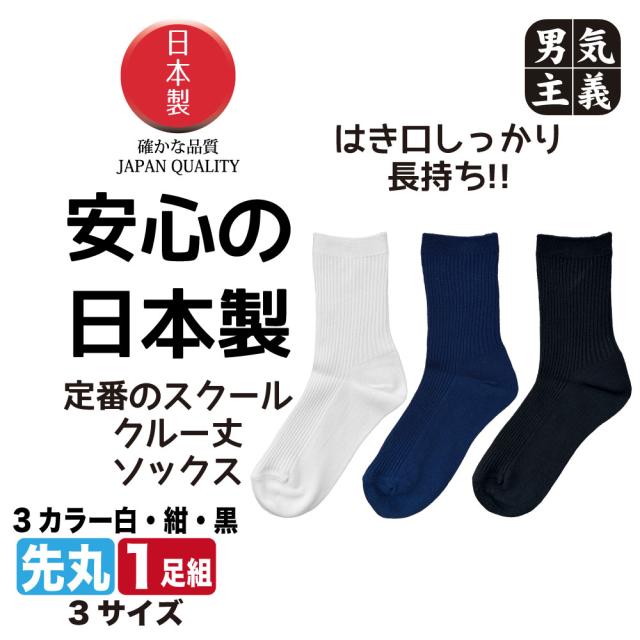 スクールソックス 1足 丈夫でほつれにくい 日本製 高品質 靴下 キッズ ジュニア 白 紺 黒 無地 クルー丈 受験 面接 冠婚葬祭 通学 小学生 中学生 16cm-24cm