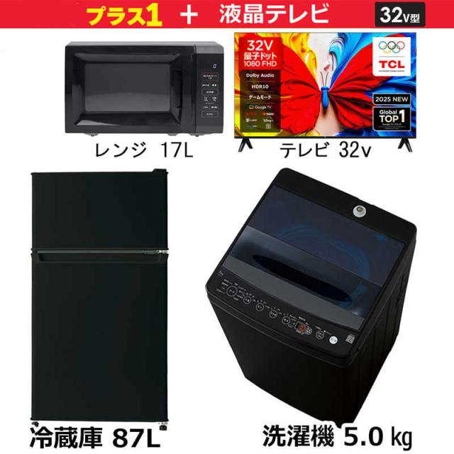新生活家電セット3点 ブラック 黒 【プラス 32V型液晶テレビ付】 冷蔵庫 / 洗濯機 / 液晶テレビ / 電子レンジ[一人暮らし家電ベーシック3点セット] (標準設置無料)