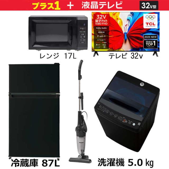 新生活家電セット4点 ブラック 黒 【プラス 32V型液晶テレビ付】 冷蔵庫 / 洗濯機 / 液晶テレビ / 電子レンジ / 掃除機[一人暮らし家電ベーシック4点セット] (標準設置無料)