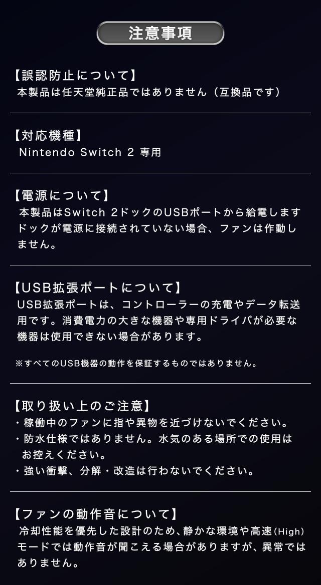 【 優れた5つのポイント 】 (1) 強力ファンでしっかり冷却 (2) ドックに挿すだけの簡単取り付け (3) 風量2段階でゲームに合わせて調節 (4) ポートをふさがないUSB拡張設計 (5) ドック一体型ですっきり収納 【熱をしっかりブロック】 強力な冷却ファンが本体の熱を外へ逃がします。長い時間ゲームをしても熱くなりにくく、安心して遊べます。大事なSwitch2をしっかり守ります。 【挿すだけ簡単スタート】 ドックに差し込むだけで使えるので、むずかしい設定はありません。電源ケーブルもいらず、届いたその日からすぐに使えます。 【風量をワンタッチ調整】 ゲームに合わせて高速・低速の2段階切り替えができます。音をおさえたい時も、しっかり冷やしたい時もボタンひとつで安心です。 【USBポートそのまま使用OK】 冷却ファンを付けてもUSBポートをふさぎません。充電やコントローラーなどの周辺機器も、いつも通り使えてとても便利です。 【ドックにピッタリ設計】 ドックと一体になる形で見た目もスッキリ。場所を取らず、お部屋のじゃまになりません。きれいに収納できます。 |