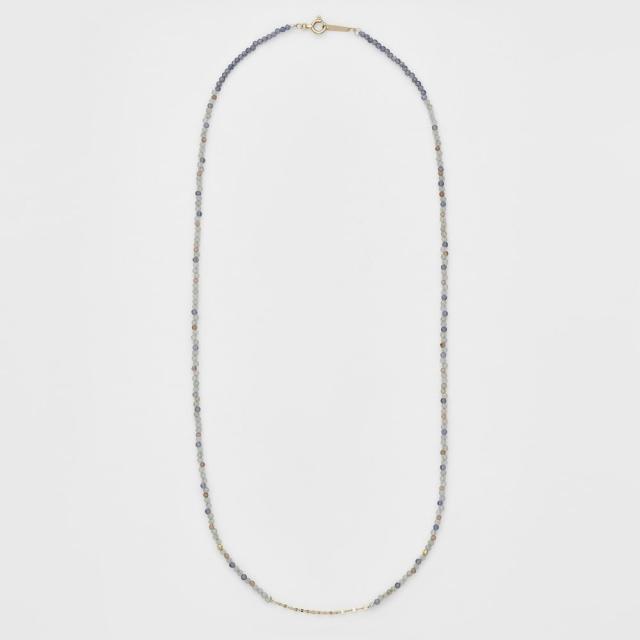 夜明けの空を思わせる、淡いブルーと静かなグレーが織りなすネックレス。グレーを基調に、3種類の天然石を組み合わせることで、シンプルながら奥行きのある色合いに仕上げました。さりげなく添えたゴールドの輝きが、石の美しさを一層引き立てます。チャームを通せる仕様になっており、気分やスタイルに合わせて自由にアレンジをお楽しみいただけます。※天然石や天然素材を使用しているものは、サイズ・色味・風合いの違いや、若干の傷、内包物の有無などに個体差があります。予めご了承ください。※石は多少のキズカケ・穴回りの欠けを許容しています。※ワイヤーは折れないように保管をお願いします。